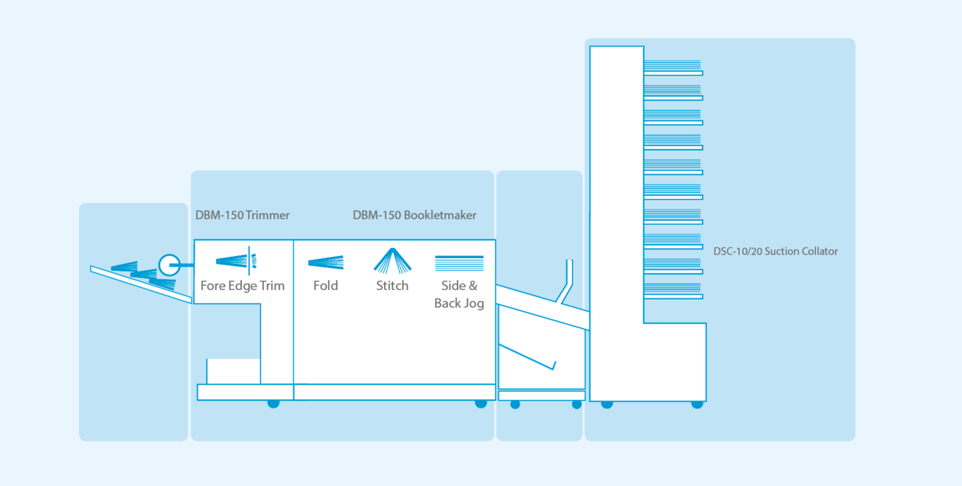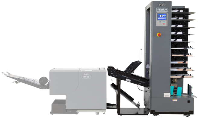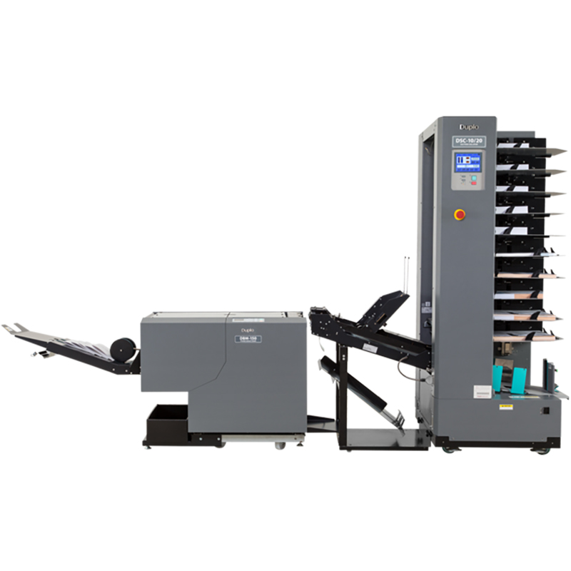 Duplo 150C Collator Booklet System is a uniquely compact and highly productive system. It is the perfect solution for fully automatic collating and booklet making. The Duplo 150C Collator Booklet System can incorporate up to 2 units of Duplo DSC-10/20 towers in-line with the Duplo DBM-150 bookletmaker and trimmer. Utilizing Duplo’s proven suction feed system, the Duplo DSC-10/20 allows for gentle handling of a wide range of applications not possible with friction feed collators. Each bin comes equipped with two adjustable fans for consistent and accurate feeding while a large pickup area of the belt suction feed system ensures that even slick coated, curled, and high static digital documents are fed consistently.