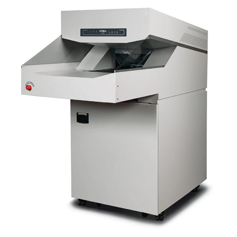 Equipped with “Super Potential Power Unit”: heavy duty chain drive system with steel gears. Carbon hardened cutting knives, unaffected by staples and metal clips. High precision design of cutting knives allows high shred loads with low power consumption. Motor thermal protection. 24 hours continuous duty motor: no duty cycle or timed cool down period.