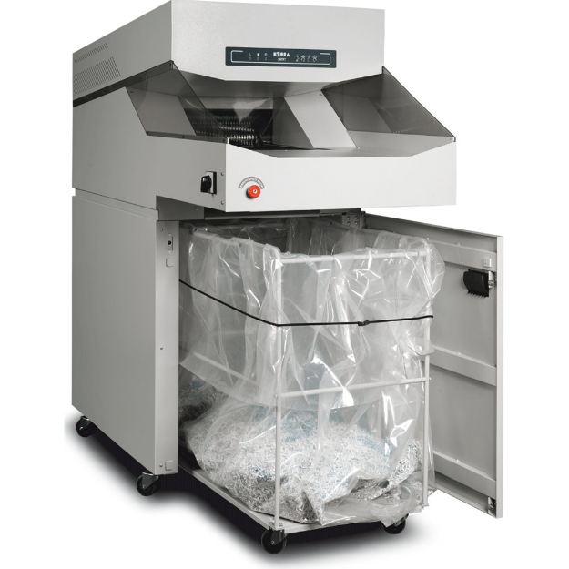 Designed for large shredding throughput and continuous shredding operations. Convenient conveyor belt for easy feeding of material to shred: can shred up to 65 sheets of paper at a time, Kobra 430 TS shreds also cds, dvds, Credit cards, floppy-disks.