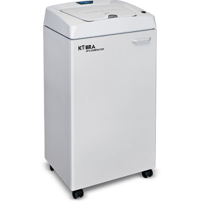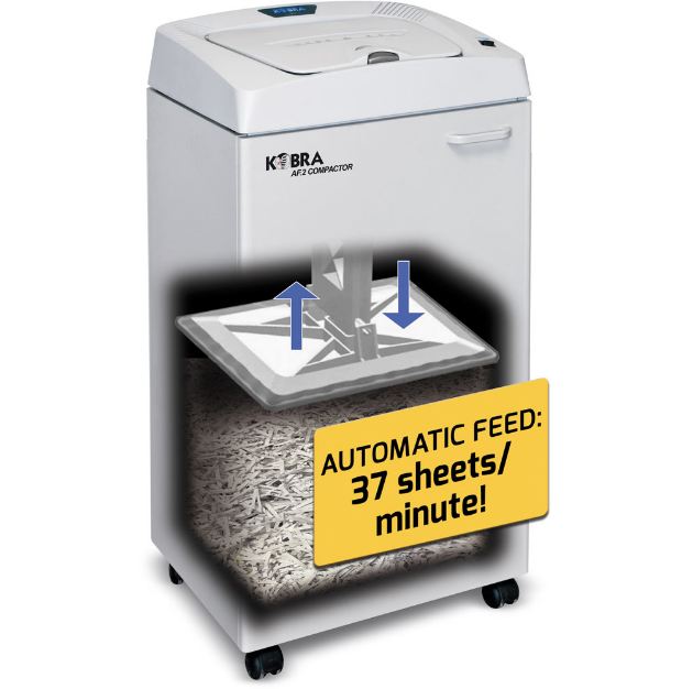 KOBRA AF.2 Auto-Feed/Auto-Compact shredder is the most innovative and fastest automatic shredder available in the global market: the special paper Compacting System optimizes bag capacity and avoids frequent emptyings, increasing by 4 times – from 150 to 600 liters – the size of the cabinet and its incredible 37 sheets per minute speed allows walkaway fast shredding of large quantities of documents.