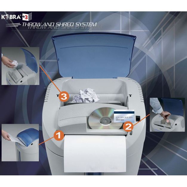 Cross-cut shredder with transparent opening lid and automatic suspension closing. Shredding capacity of up to 14 sheets at a time by just inserting them into the throat on the front. Shreds CD-ROMs, DVD and credit cards by inserting them into the 2nd throat. Also shreds crumpled paper using the revolutionary new “THROW AND SHRED” System with its special automatic feeder with rotating flaps.